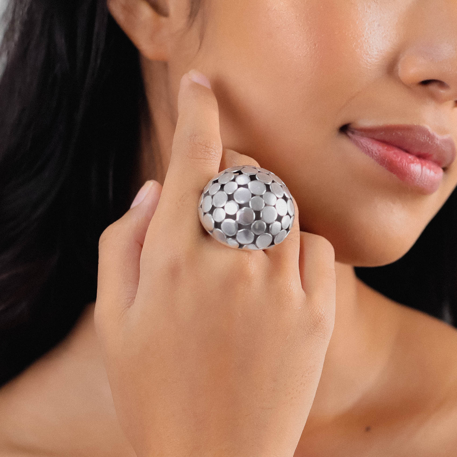 ფრანგული ბრენდი Ori Taos ს ხელნაკეთი ბეჭედი, კოლექციიდან DISCO. სამკაულის ბაზად გამოყენებულია თითბერი, კოლექციაში გამოყენებული ნატურალური მასალები და ქვები: მტკნარი წყლის მარგალიტი, თეთრი სადაფი, თითბერი.