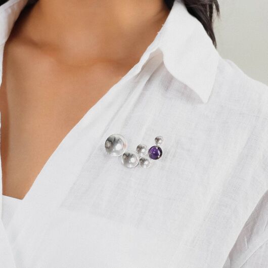 ფრანგული ბრენდი Ori Taos ს ხელნაკეთი ბროში, კოლექციიდან JIMILI. სამკაულის ბაზად გამოყენებულია თითბერი, კოლექციაში გამოყენებული ნატურალური მასალები და ქვები: აქატი, ლაპის ლაზული, თითბერი