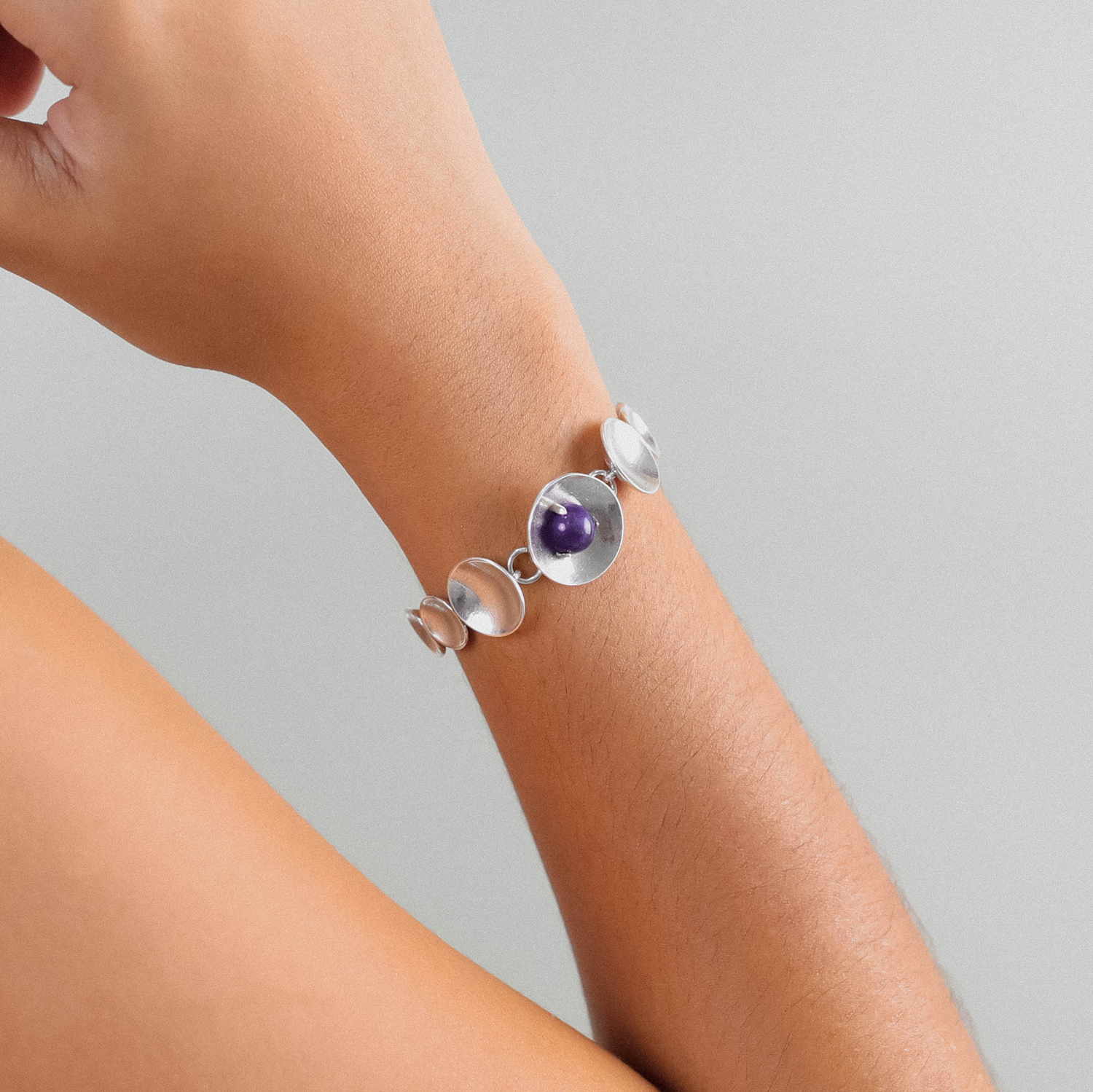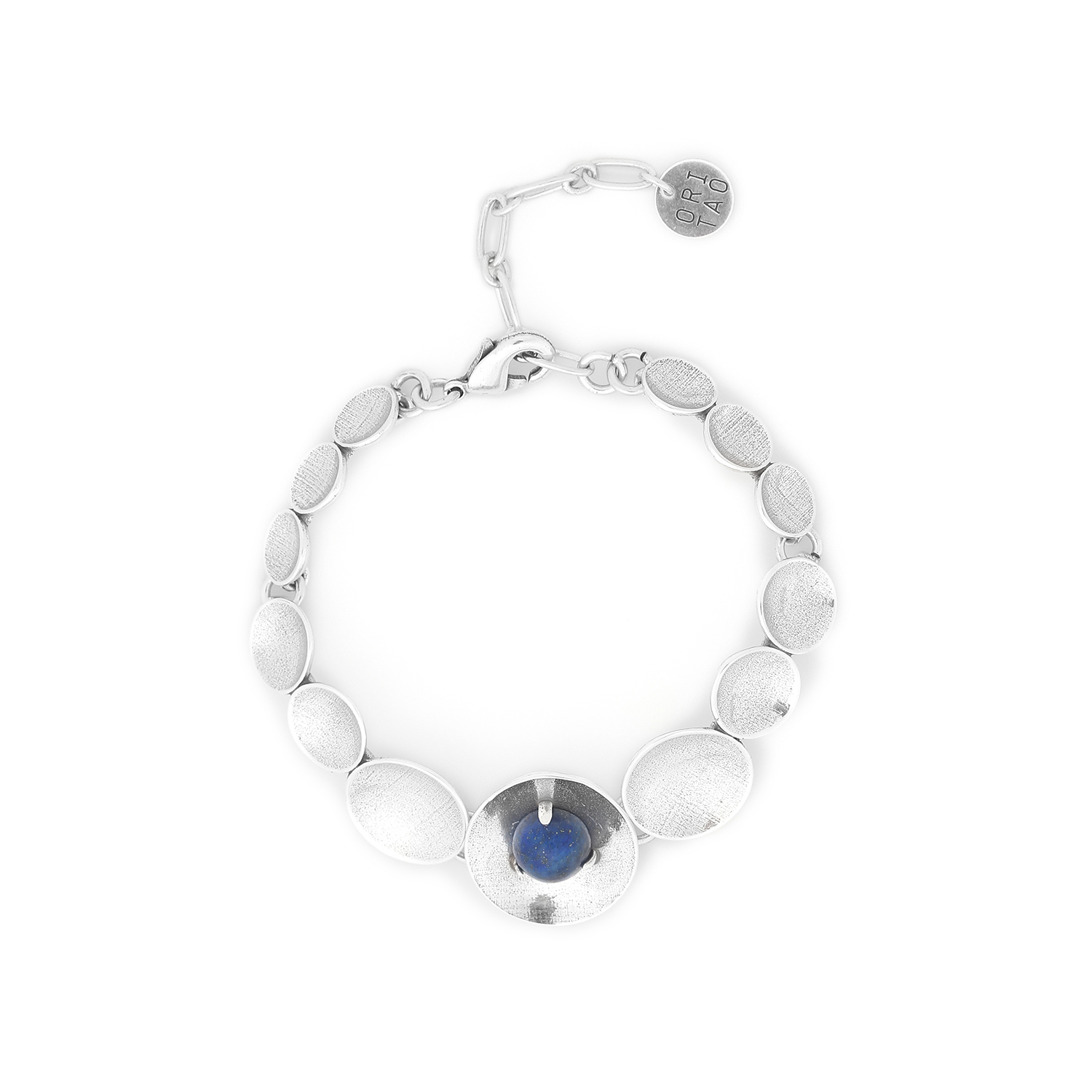 ფრანგული ბრენდი Ori Taos ს ხელნაკეთი სამაჯური, კოლექციიდან JIMILI. სამკაულის ბაზად გამოყენებულია თითბერი, კოლექციაში გამოყენებული ნატურალური მასალები და ქვები: აქატი, ლაპის ლაზული, თითბერი